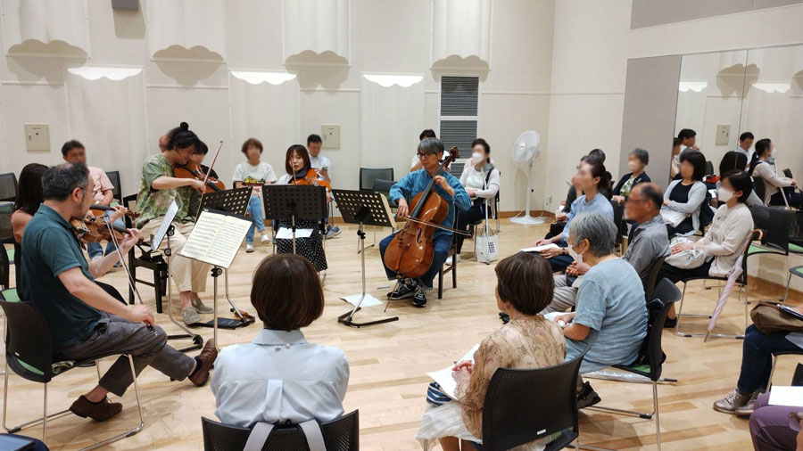 クラシック音楽への接し方が変わってゆくきっかけになるかもしれない。そんな大きい期待さえ覚えてしまうくらいに、生の音楽体験に対する新しい視野と方法論を提示するのが「おんがくの寺子屋」である。2021年秋よりNHK交響楽団首席奏者を務める、名ヴィオリスト村上淳一郎が「座長」となり、10~20人の参加者(弦楽器中心)と室内楽作品を取り上げ、毎年開催されている。開催地によって主催者は異なるものの、村上を中心とする「寺子屋」というあり方は共通しており、2025年5月中旬には 大阪・箕面で4日間の公開リハーサル(5/13~5/16)と演奏会(5/17)からなる「おんがくの寺子屋みのお」が開かれる。