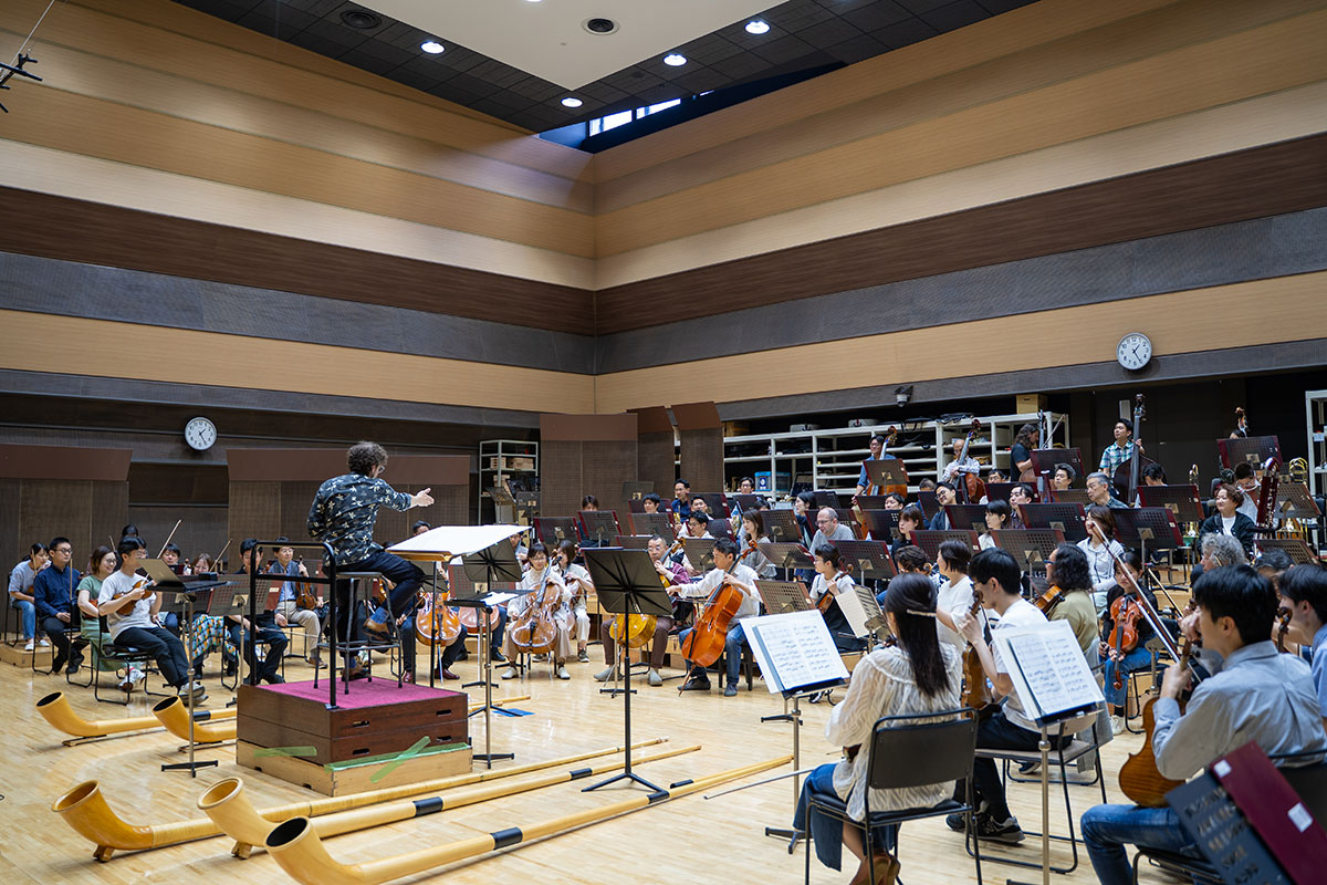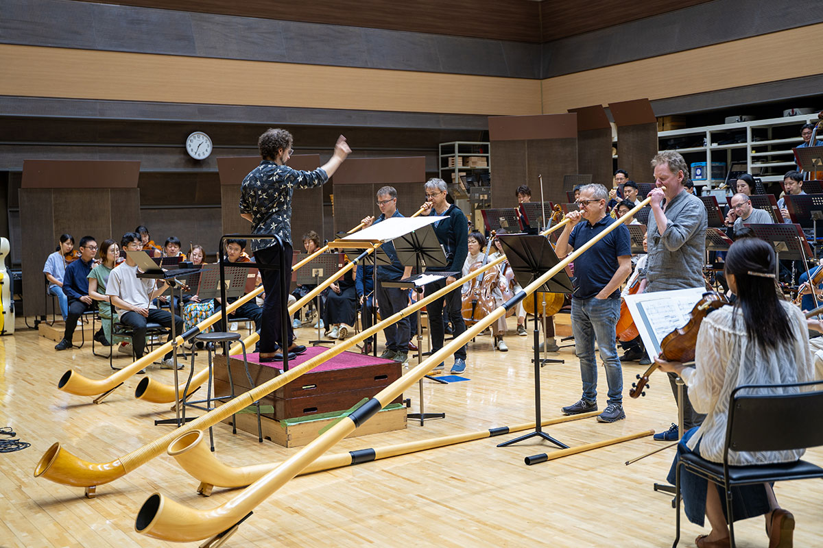 いよいよリハーサルの2曲目は《コンチェルト・グロッソ第1番》。前半はアルプホルン奏者が見守りに徹し、オーケストラだけで細部をつめていく。まずは演奏するたびにテンポを柔軟に変更する必要がある部分から練習がはじまった。どういうことかといえば、2つの音が鳴ったとき、全く同じ周波数だと完全に調和するのだが、少しでもずれるとヴィブラートのような“うなり”が発生する(いわゆる不協和音とは違うもの)。この“うなり”の周期にあわせて打楽器が刻むパルスが、新しいテンポとなっていく……というつくりになっているのだ!(アルプホルンには手で操作するピストンやバルブは付いていないので、ナチュラルトランペットのように唇の感覚だけで音の高さを変えていく。だから演奏のたびに“うなり”の速さが結構変わってしまう)。こうすることで自然な音の物理現象から有機的に音楽が生まれていくかのような印象を観客にもたらしてくれるのが面白い。