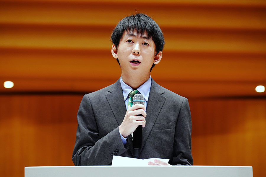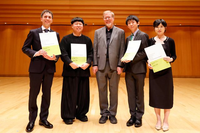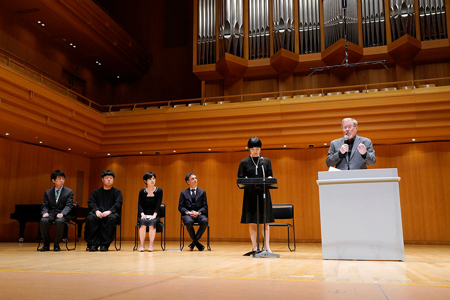 休憩の後、ハースの講評、順位発表、授賞式、受賞者のスピーチと続いた。結果は我妻・金田が共に1位、チョウとマリオッティが3位。どの作品もイメージの喚起力に長け、中でもアイディアをストレートに形にした作品が上位にきたのが興味深かった。ハースが各作品をどうとらえたのかは、本選後のスピーチが東京オペラシティ文化財団のウェブサイトに公開されているので御覧いただきたい。賞金総額300万円を5:4に分割して、第1位の二人に833,333円、第3位の二人に666,667円ずつ授与したのが、いかにも微分音の大家らしく微笑ましかった。
