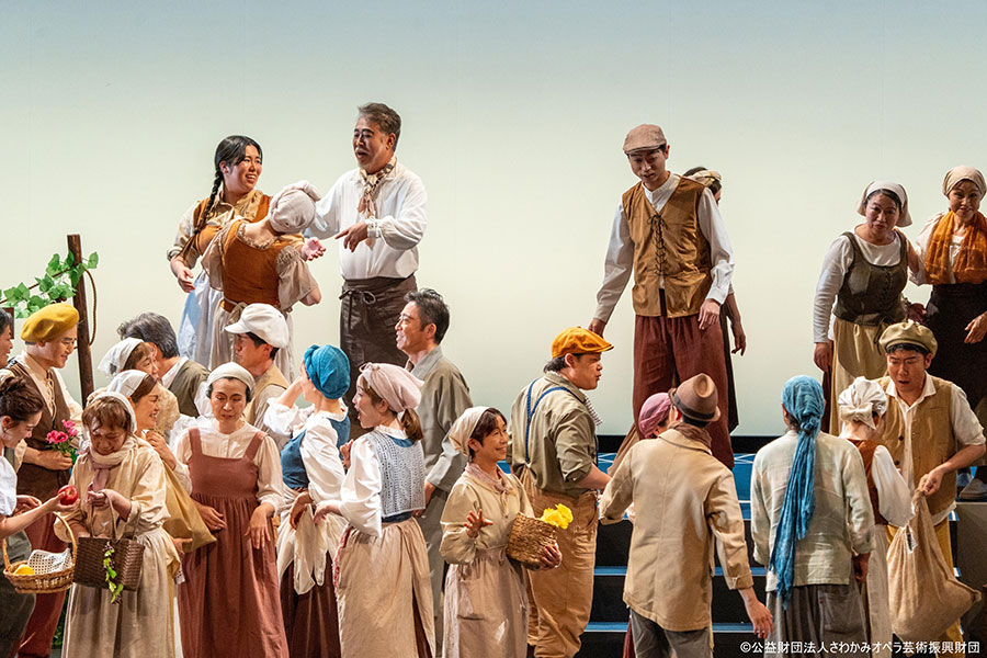 5月24日、青森県の弘前市民会館でオペラを通じて地域活性化を試みるチャレンジングな公演が開催された。主催したのは、「日本にオペラ文化を広め、多くの人に『感動』と『心の贅沢』を」を合言葉に、10年以上精力的な活動を続けているさわかみオペラ芸術振興財団。演目はドニゼッティ作曲の《愛の妙薬》。ソリストはもちろんプロのオペラ歌手だが、注目したいのは全国から集結した総勢39名の合唱団。地元青森の「コーロ・クアトロミッレ」から21名、徳島の「コーロ・インダコ」が9名、喜多方の「酒蔵オペラ合唱団」8名、そして南魚沼の「オペラ合唱団うたのみ」から1名と、4つの団体に所属する歌い手たちで構成されている。彼らは別々の地域で暮らしながら、さわかみオペラが派遣するプロの歌手に年間を通じて歌と演技の指導を受け、日々練習に励んでいるいわゆるアマチュアの合唱団員たち。23年に創設されたばかりの青森の合唱団が、今回のオペラ公演に出演するということで、“先輩”にあたるさわかみオペラ合唱団の有志たちがサポートのために弘前に集結した。