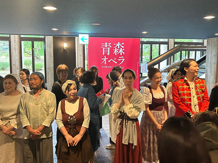 そして本番。ソロを務める歌手とともに合唱メンバーも演技を交え堂々とした歌いっぷり。見せ場の後には客席からBravo!やBravi!の声が飛び、出演者も客席も全員笑顔、会場全体でひとつの公演を盛り上げていった。カーテンコールでは、初めてのステージとは思えないパフォーマンスを見せた青森の合唱メンバーをはじめ全員が完全燃焼の表情。盛大な拍手に導かれ、何度もステージに呼び出された。さらに終演後には、出演者全員がロビーに出てお見送り。最後まで観客を楽しませた。