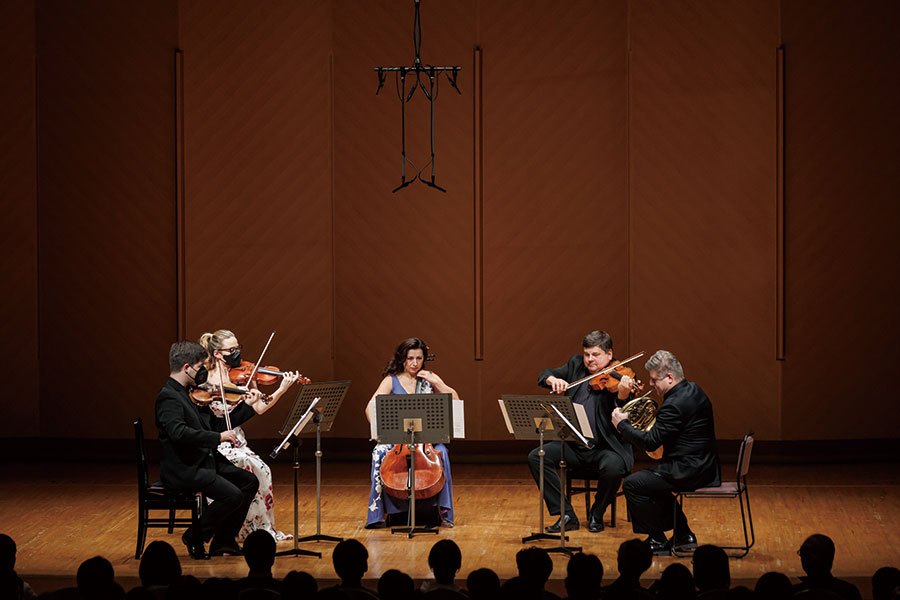 秋の来日はバボラーク・アンサンブルとの室内楽。始まりは20年以上前のプラハ音楽院時代の弦の同級生たちとのユニットで(チェロのハナ・バボラコヴァはバボラーク夫人)、後に参加した若いメンバーも「弦の国」チェコゆかりの奏者たち。プラハを拠点にする日本人ヴァイオリニスト髙橋紘子も加わった。