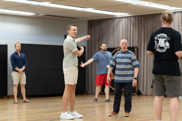 懇親会後に行われたリハーサル(立ち稽古)は一部が報道関係者に公開され、開始前には出席者に向けペリー自ら取り上げる場面について説明を行った。練習箇所を通した後、立ち位置や演技のタイミングが細やかに調整される中、沖澤とペリー、歌い手の三者で時間をかけて打ち合わせを行う場面も。