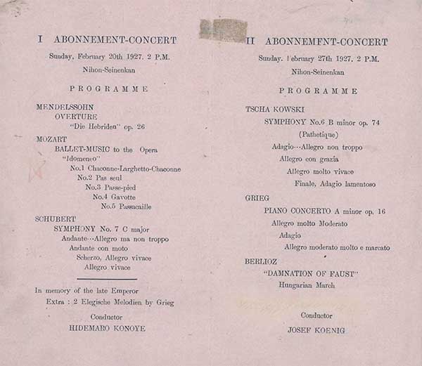 1927年の第1回と第2回の定期公演。日本語がなく、欧文表記のみになっている。第1回のプログラムはメンデルスゾーン「フィンガルの洞窟」、モーツァルト《イドメネオ》のためのバレエ音楽、シューベルトの交響曲第7番(当時は『ザ・グレート』)。指揮は近衛秀麿(第1回)、ヨーゼフ・ケーニヒ(第2回)。