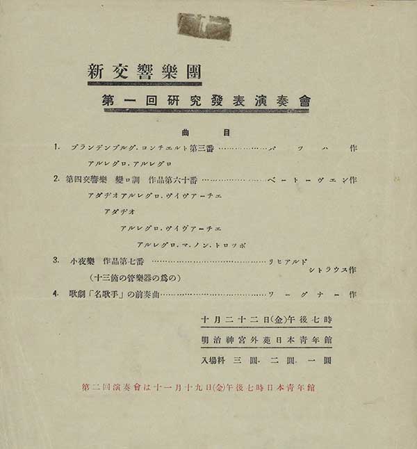 1926年10月、「新交響楽団」という名称で結成したNHK交響楽団の、まさに一番最初の演奏会。バッハのブランデンブルク協奏曲第3番、ベートーヴェンの交響曲第4番、R.シュトラウスの13管楽器のためのセレナード、ワーグナーの《ニュルンベルクのマイスタージンガー》前奏曲という曲が並ぶ。「マイスタージンガー」は「名歌手」と書かれている。入場料は3円、2円、1円とある。