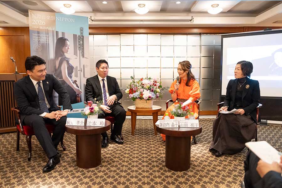 国際音楽祭NIPPON 2026の記者会見が都内で行われ、芸術監督の諏訪内晶子、チェリストの辻本玲、ピアニストの秋元孝介らが登壇した。