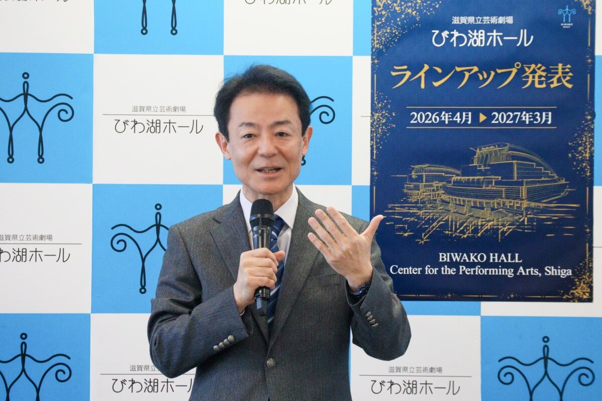 1月23日、滋賀県立芸術劇場 びわ湖ホールが令和8年度(2026年4月〜27年3月)の自主事業ラインナップを発表。ホール内で記者発表が行われ、芸術監督の阪哲朗、館長の村田和彦らが登壇した。