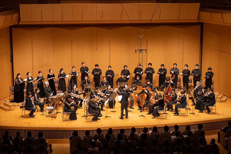 休憩を挟んで「レクイエム」。1曲目はかなり遅いテンポで始めて徐々にテンポを上げ、永遠の安息を「授けてください」の「ドナ Dona(授けて)」を強調。「ディエス・イレ Dies irae(怒りの日)」の合唱はホールを震撼させるほどの本気度満点の熱唱だ。濱田はここでも曲の情感(アフェクト)に従って柔軟にアゴーギクを施し、音楽を生き生きと息づかせる。「トゥーバ・ミルム Tuba mirum(驚くべきラッパが)」の後半、最後の審判を前にした者の孤独と心の震え、「レックス・トレメンデ Rex tremende(恐るべき王よ)」の冒頭「レックス Rex(王よ)」の叫び、旋回しながら静かに舞い降りるヴァイオリンとともに歌われる四重唱の哀切。「コンフターティス Confutatis(黙らせるとき)」の緊迫感と、不義なる者を炎にくべるときに祝福された人々とともに「私をお呼びください」と神に懇願するときのかそけきソット・ヴォーチェ。啜り泣きのような、これ以上ないほどの最弱音で歌い出される絶筆「ラクリモーサ Lacrimosa(涙の日)」。