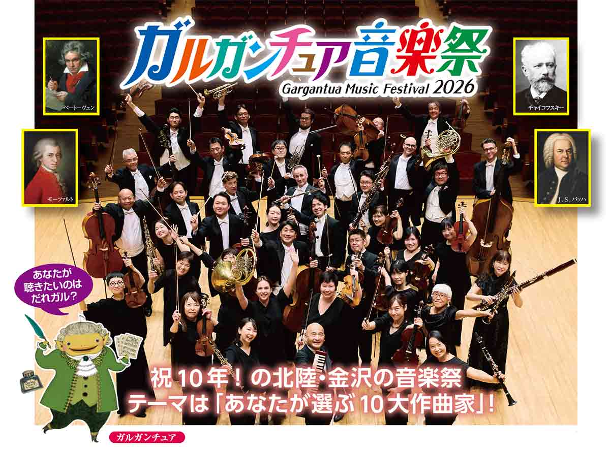 ガルガンチュア音楽祭の2026年のテーマは「あなたが選ぶ10大作曲家〜北陸・金沢10年の音楽旅路〜」。アンケートにより選ばれた人気の作曲家10人を軸としたプログラムが組まれた。その10人とはベートーヴェン、モーツァルト、チャイコフスキー、バッハ、ショパン、ブラームス、ドヴォルザーク、ラフマニノフ、ラヴェル、サン=サーンス。クラシック音楽の核心ともいうべき大作曲家たちが並ぶ。地元オーケストラ・アンサンブル金沢(以下OEK)に加えて、ミュンヘン・ゲルトナープラッツ州立劇場管弦楽団、東京フィルハーモニー交響楽団が参加するほか、ギドン・クレーメル、服部百音、阪田知樹、児玉隼人らソリスト陣も華やかだ。